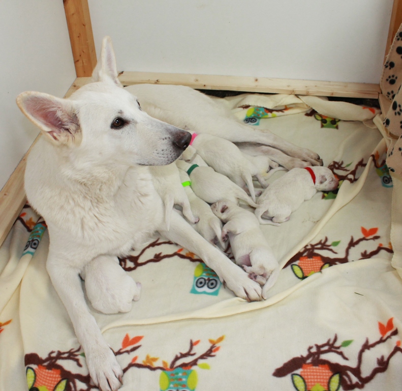 Dieses Mal hat Aby Ihre Mäuse genau an Ihrem Stichtag bekommen und wir gingen eigentlich davon aus, dass sie genau wie bei Ihren anderen beiden Würfen, 3 Tage vor dem errechneten Termin die Welpen bekommt. Doch Aby hat uns warten lassen...... die “ Kleenen “ kamen am 27.01.2015 zur Welt! Der erste um 3:00 morgens und der Letzte um 11:50 Uhr. Aby hat die Geburt ganz toll gemeistert und sich auch ganz hingebungsvoll um sie gekümmert!!! Alle G`leins haben auch schon zugenommen...... hier nun die Geburtsdaten: